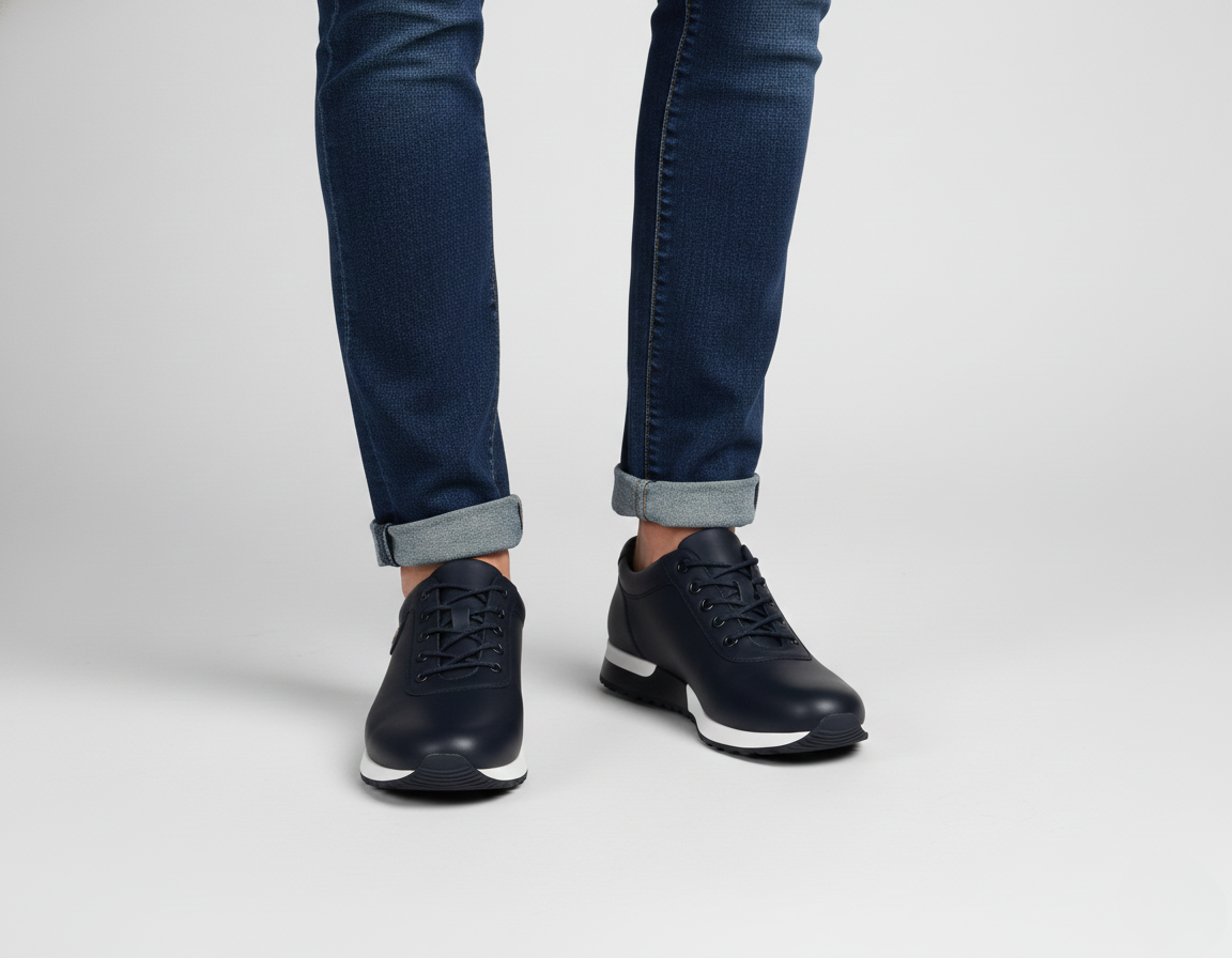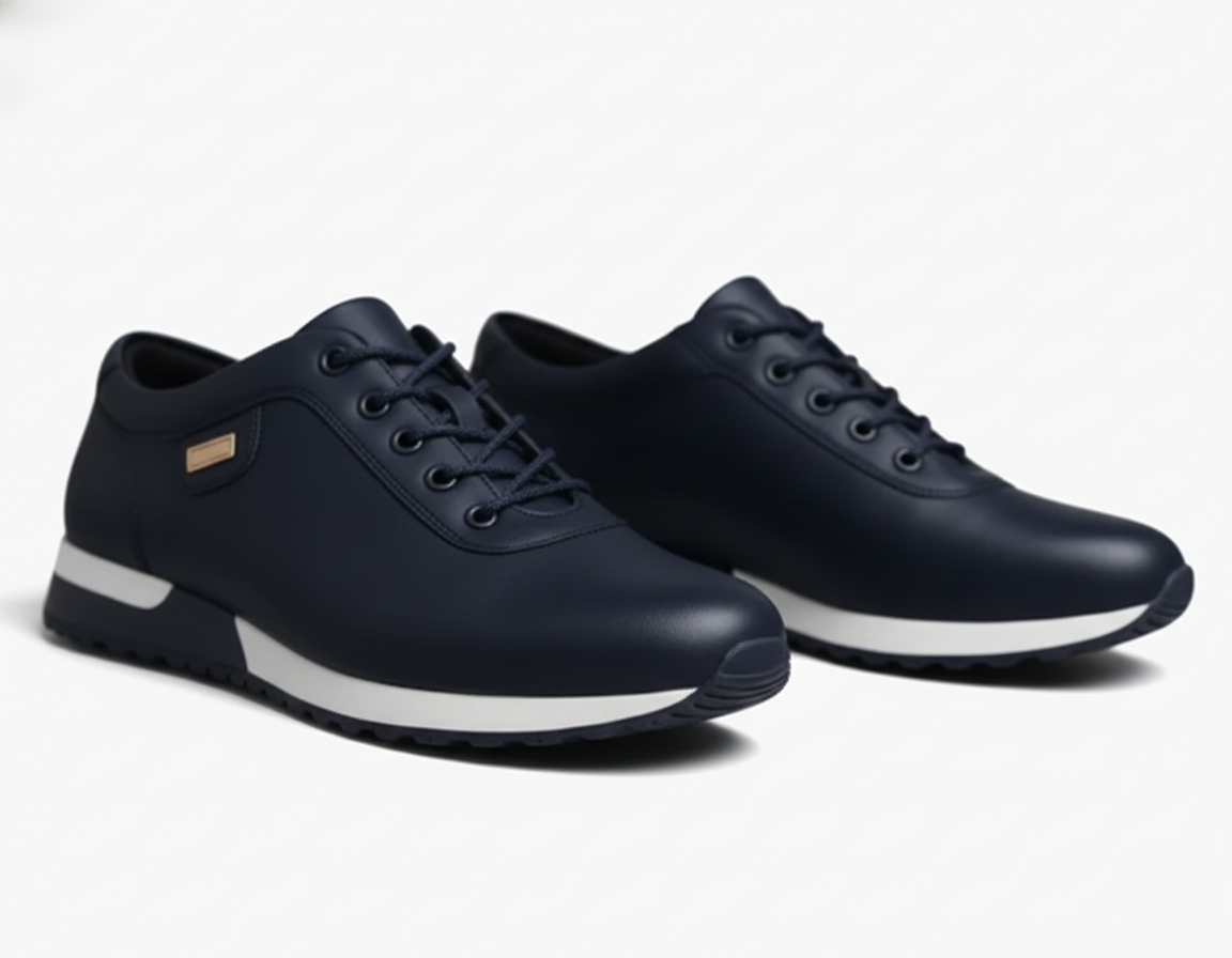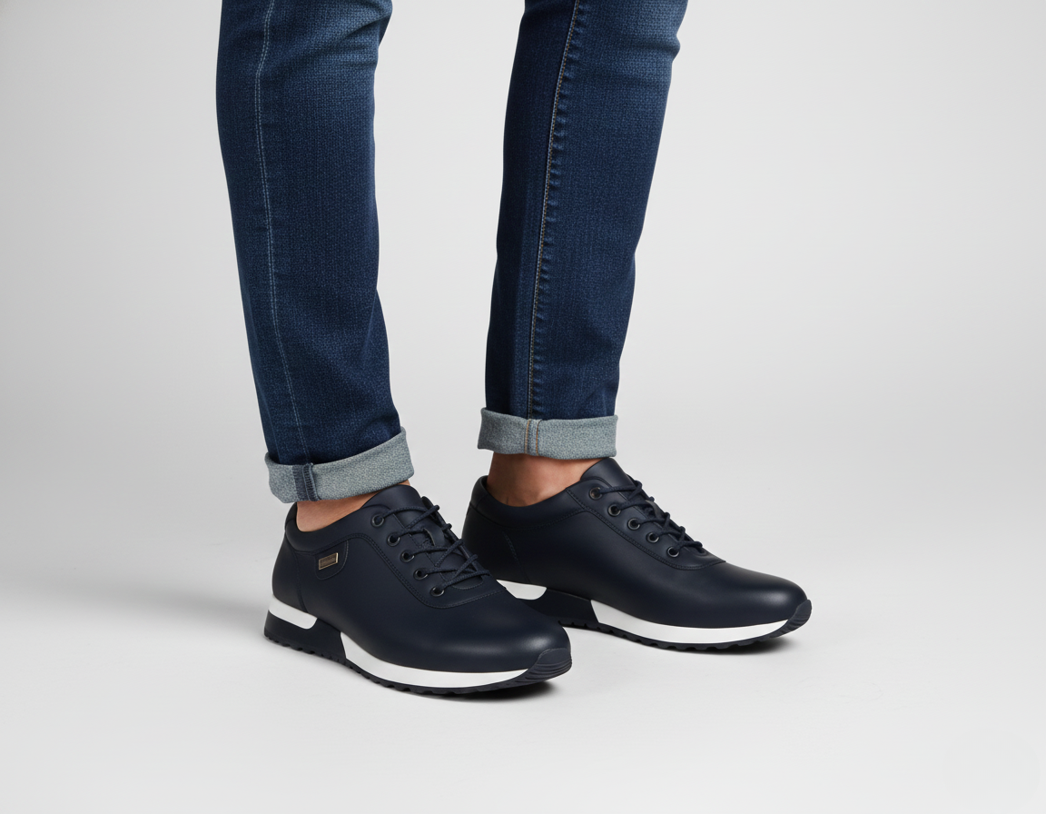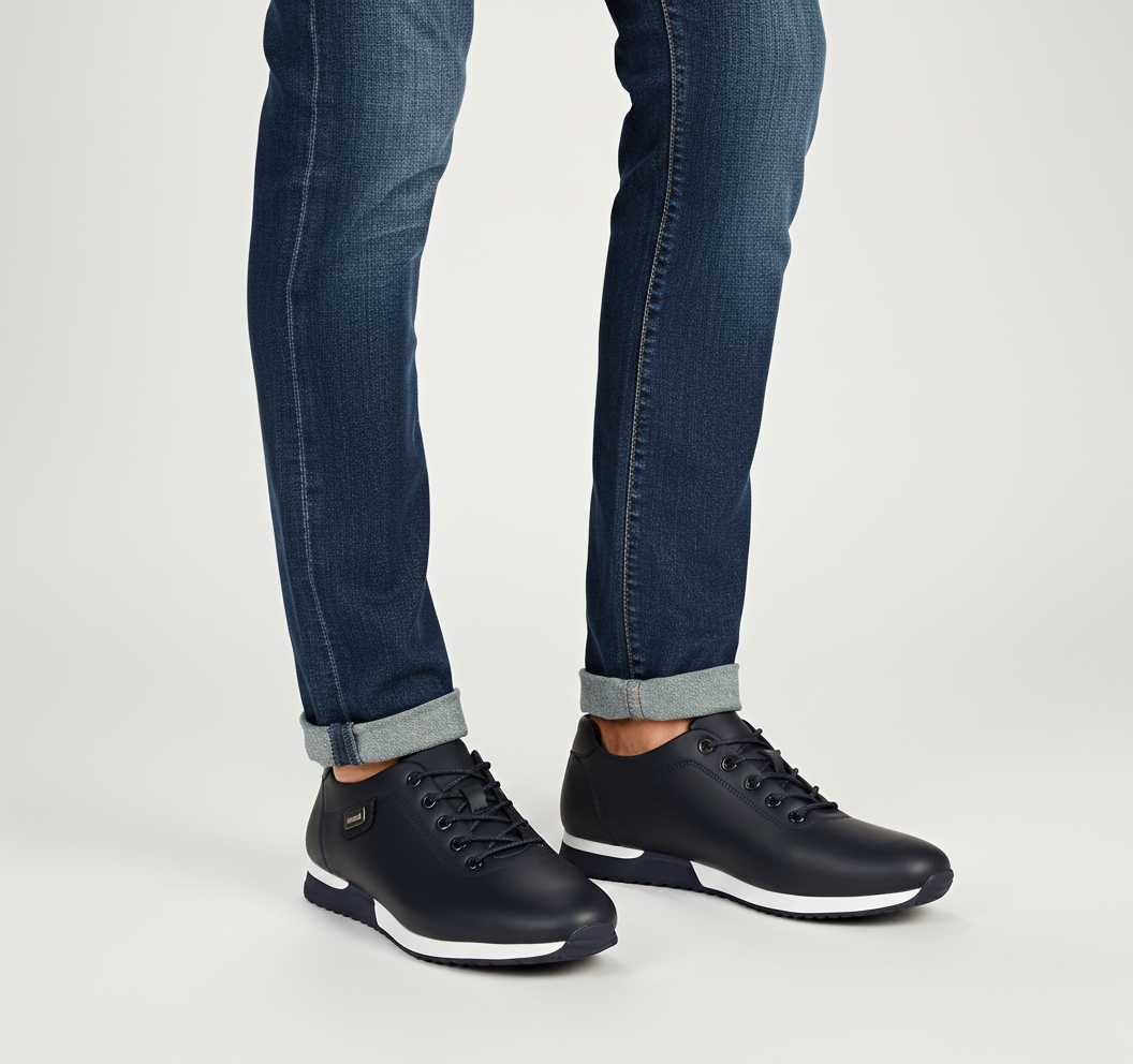These men’s sneakers combine a sleek low-cut design with a classic lace-up front and reinforced eyelets. The round toe and minimalist interior create a clean, modern look, while the textured rubber outsole ensures reliable grip. A flat heel with a layered midsole adds a contemporary touch.