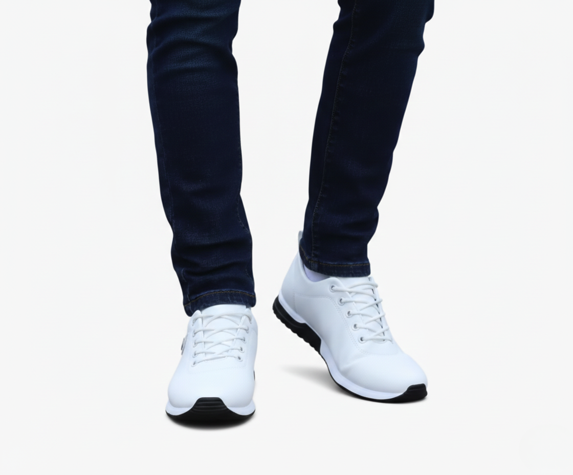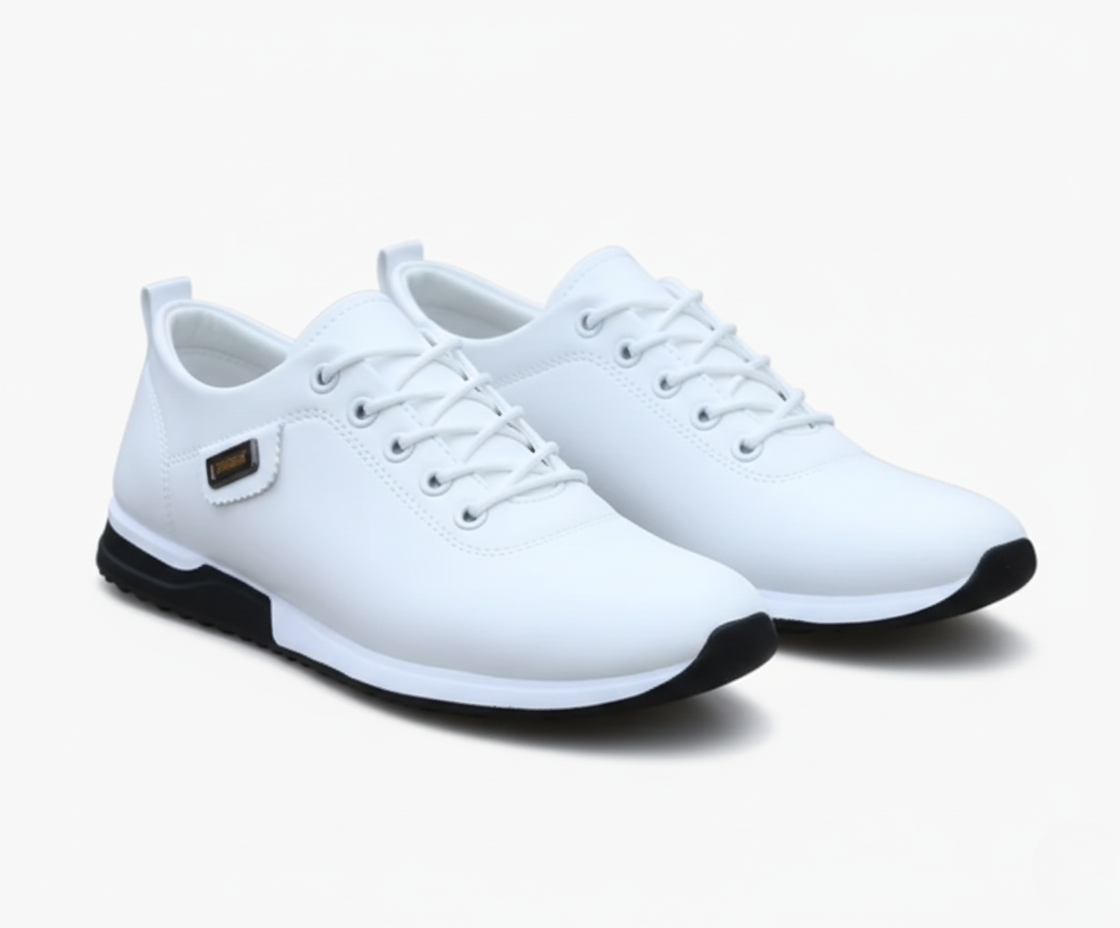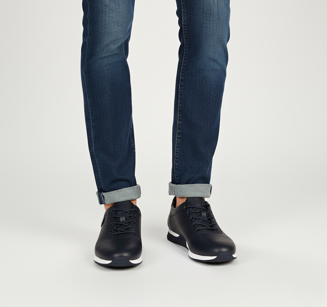 These men’s sneakers combine a sleek low-cut design with a classic lace-up front and reinforced eyelets. The round toe and minimalist interior create a clean, modern look, while the textured rubber outsole ensures reliable grip. A flat heel with a layered midsole adds a contemporary touch.