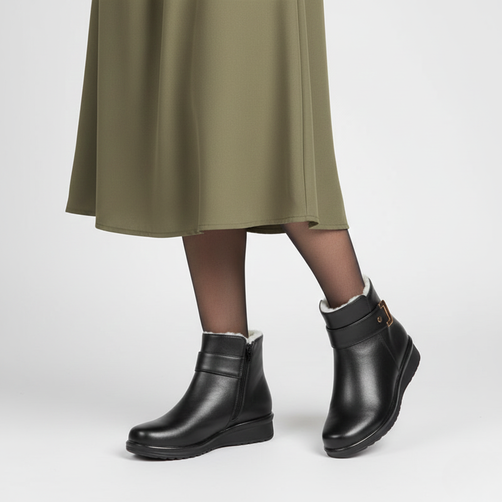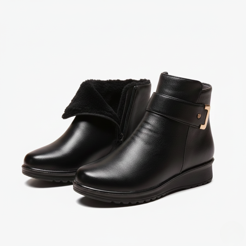 Stay warm and stylish with these women’s winter ankle boots, designed for comfort and everyday wear. The boots feature a smooth, plain upper with a rounded toe and a convenient side zipper for easy on-and-off. Inside, a full faux-fur lining extends up to the ankle, ensuring excellent warmth and insulation. A decorative outer strap with a metal buckle adds a touch of style, while the flat, non-slip sole provides reliable traction on various surfaces.