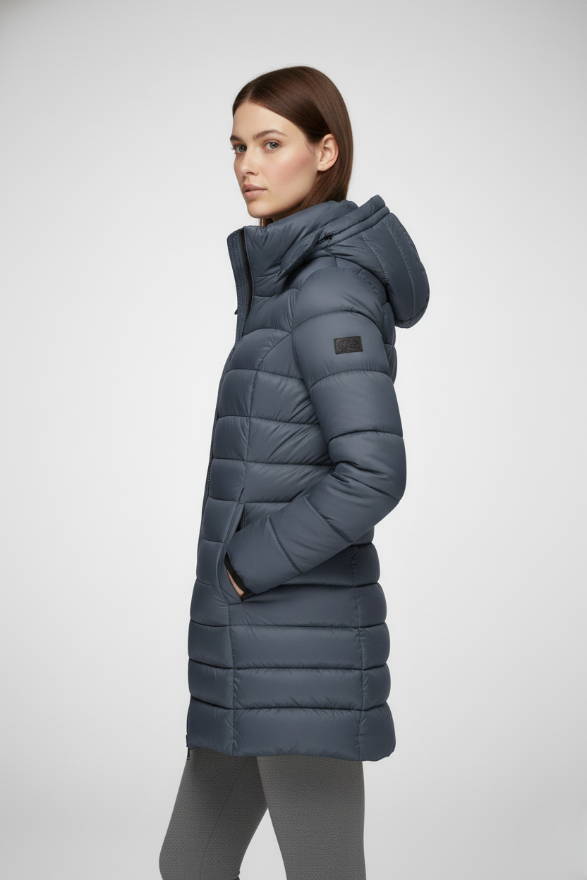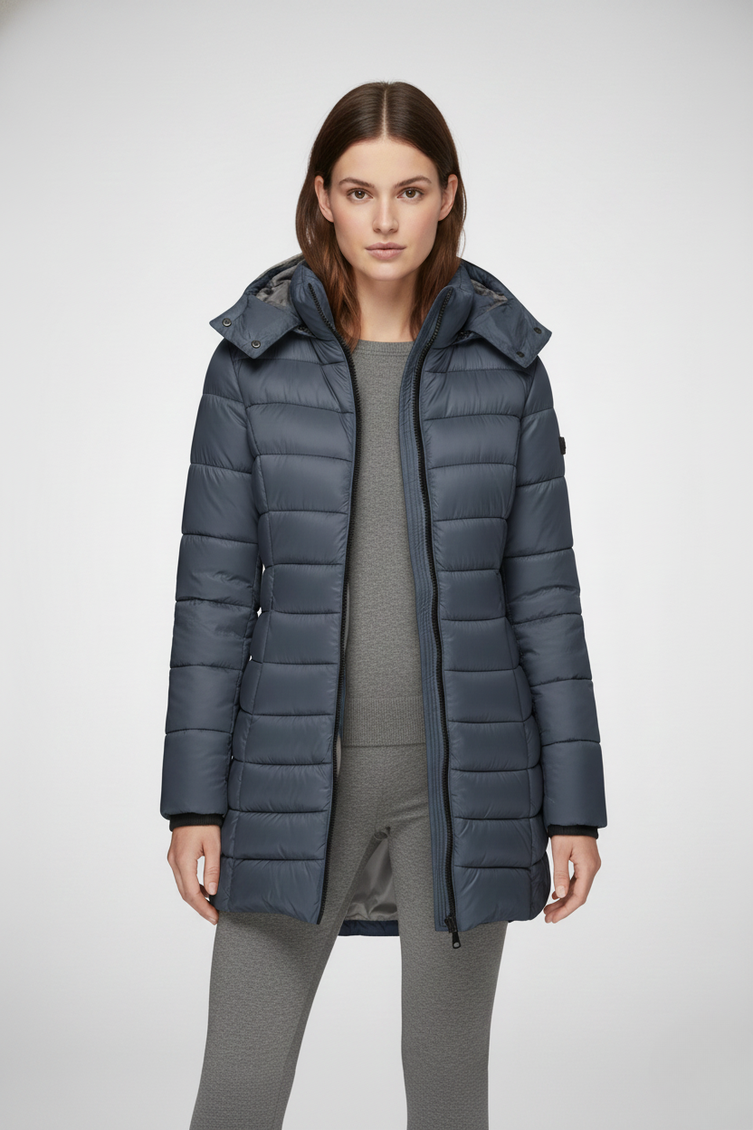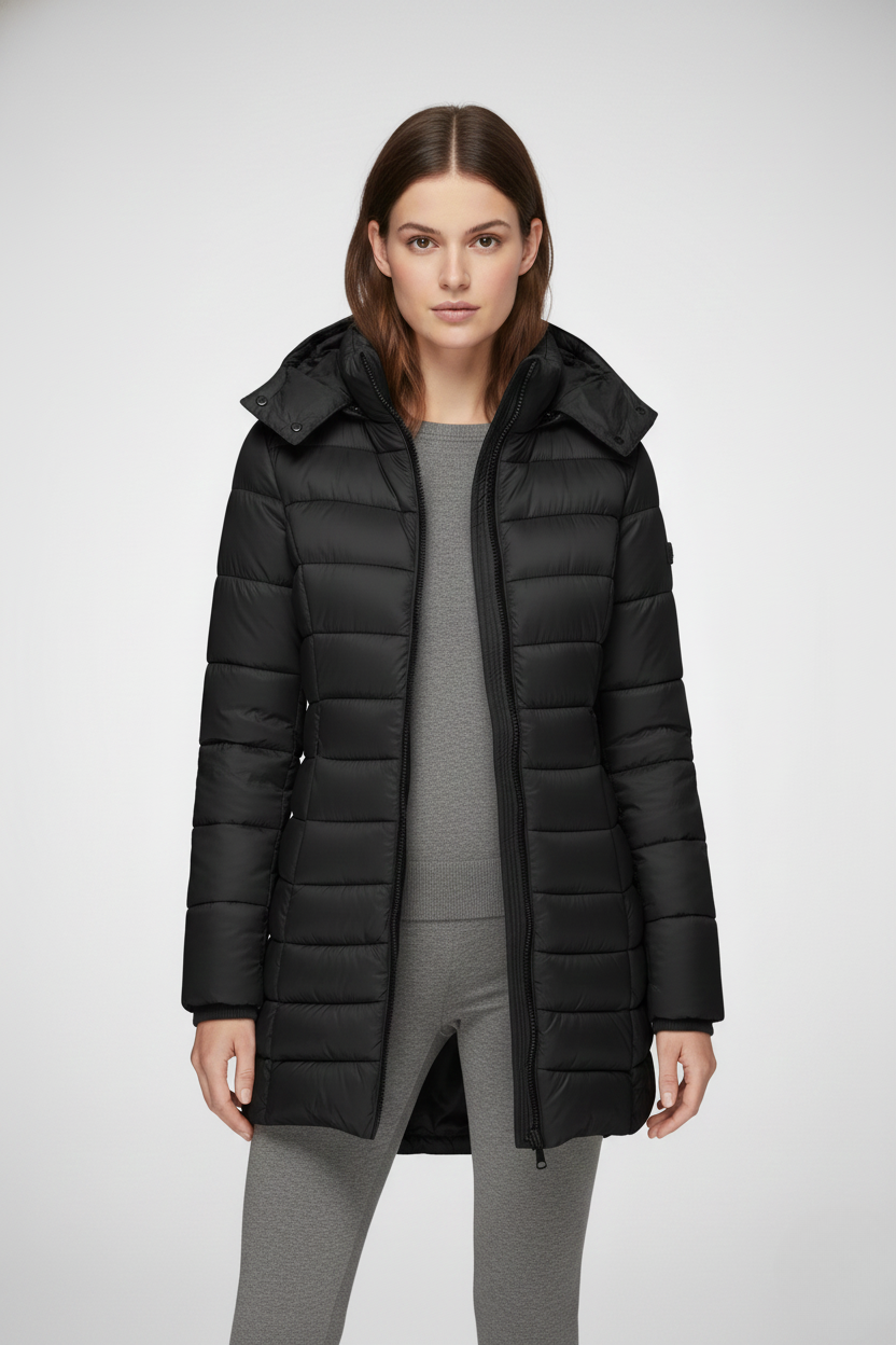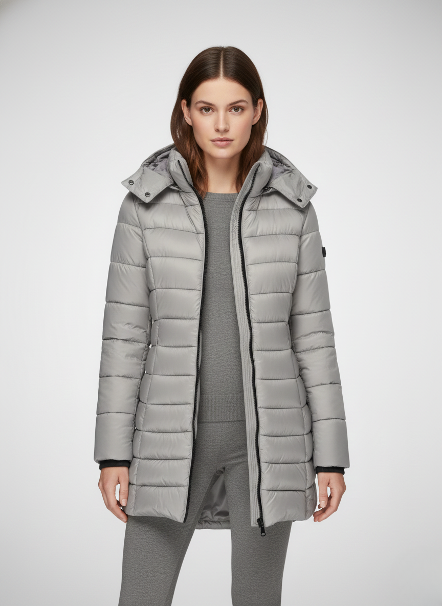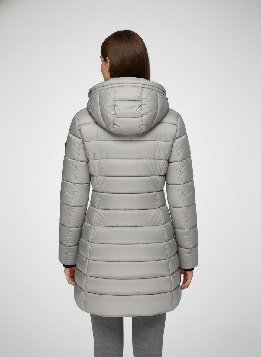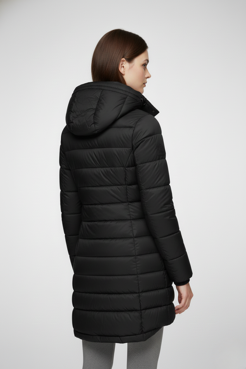 This women’s heated jacket features a fixed hood, a full-length front zipper, and long sleeves finished with ribbed cuffs. The quilted pattern extends across both the body and sleeves, while the side seams create a flattering, close-fitting silhouette. The extended hem falls below the hips, providing added warmth and coverage—perfect for layering in cold weather.