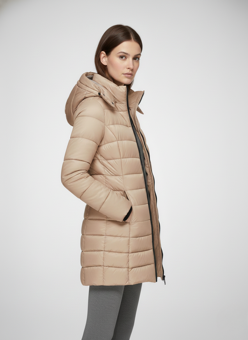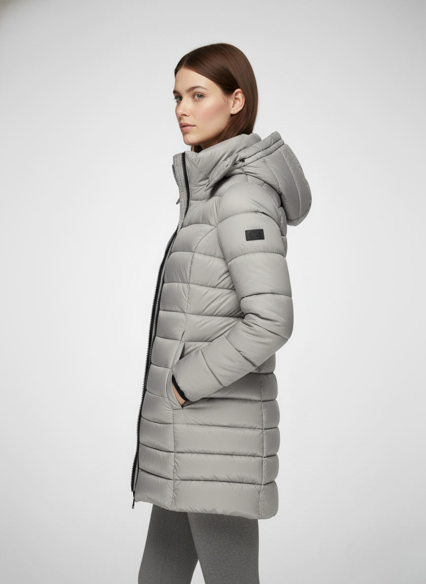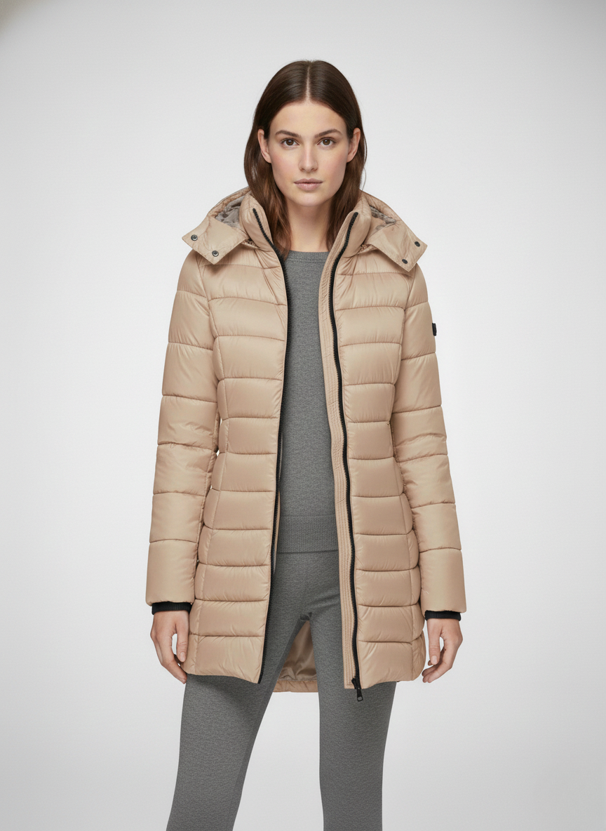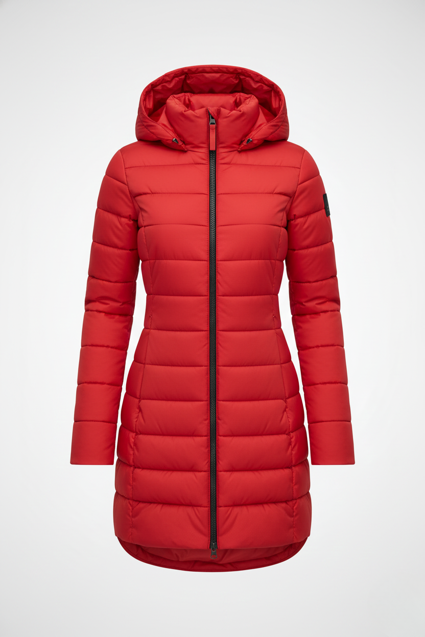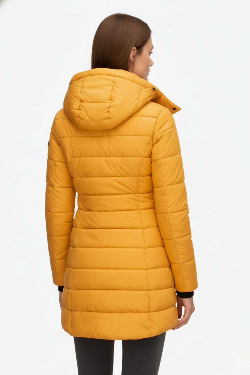This women’s heated jacket features a fixed hood, a full-length front zipper, and long sleeves finished with ribbed cuffs. The quilted pattern extends across both the body and sleeves, while the side seams create a flattering, close-fitting silhouette. The extended hem falls below the hips, providing added warmth and coverage—perfect for layering in cold weather.