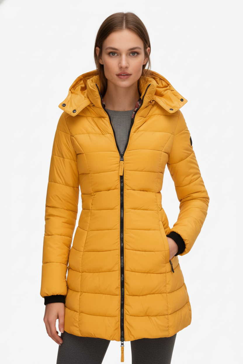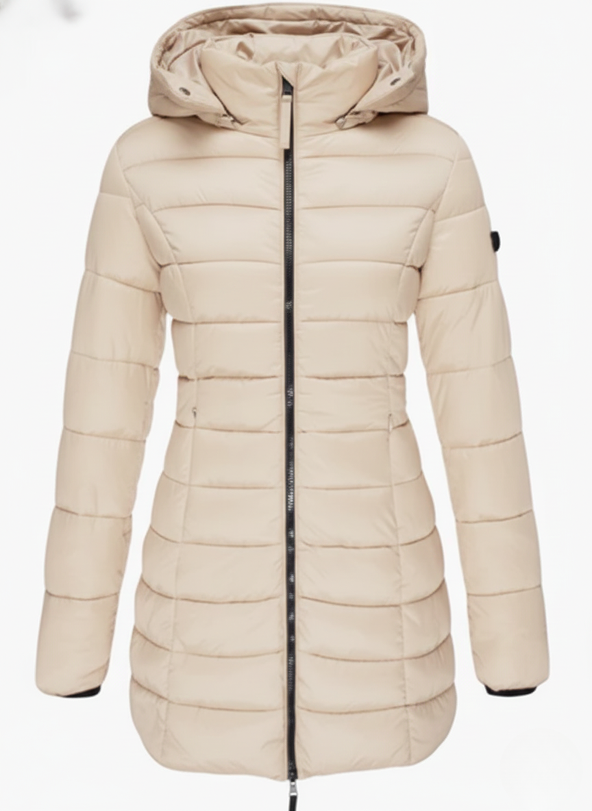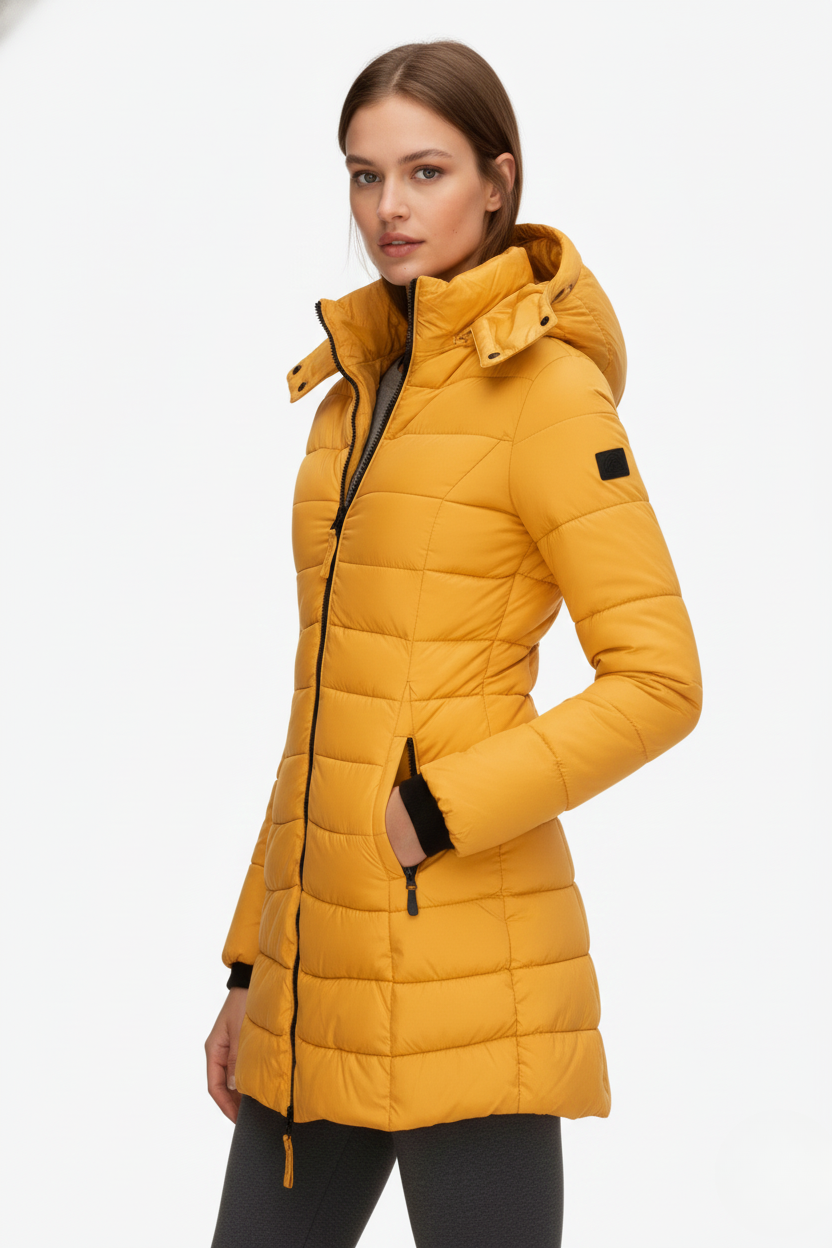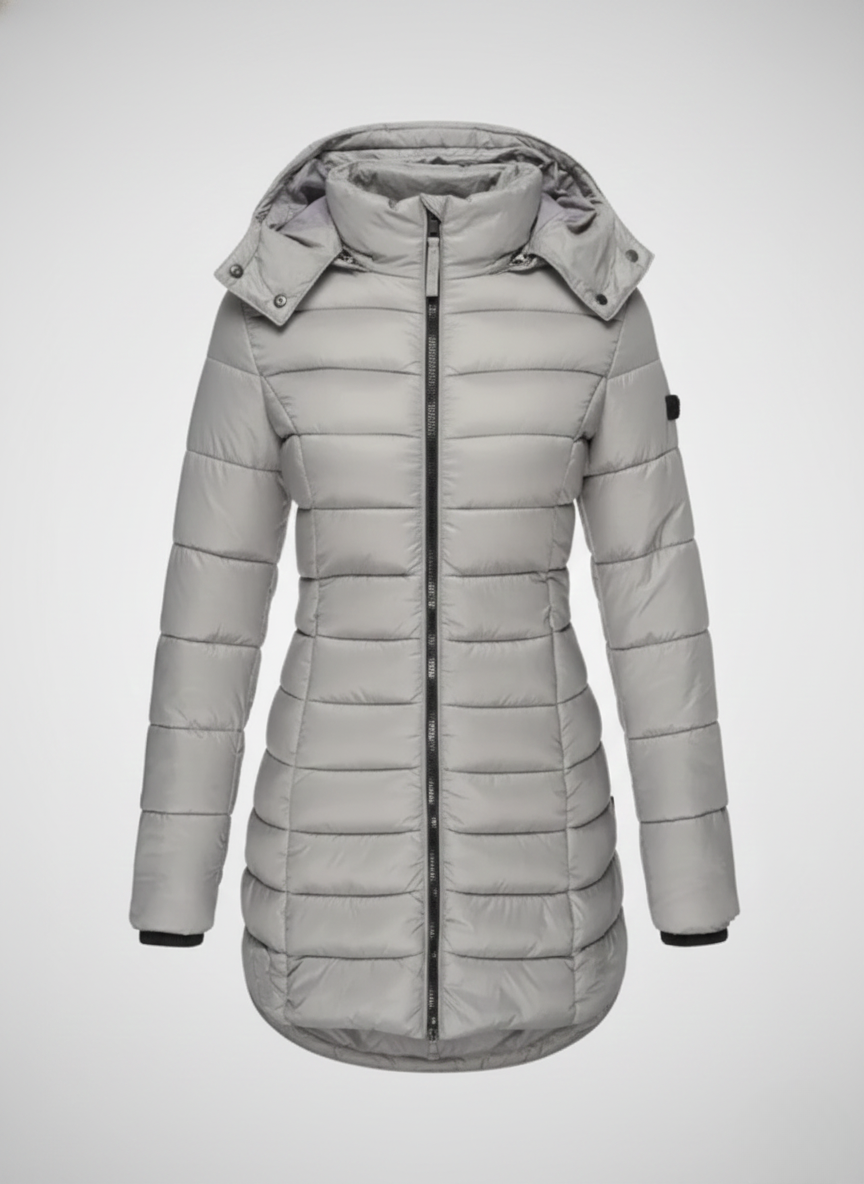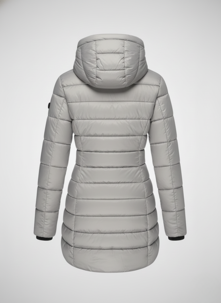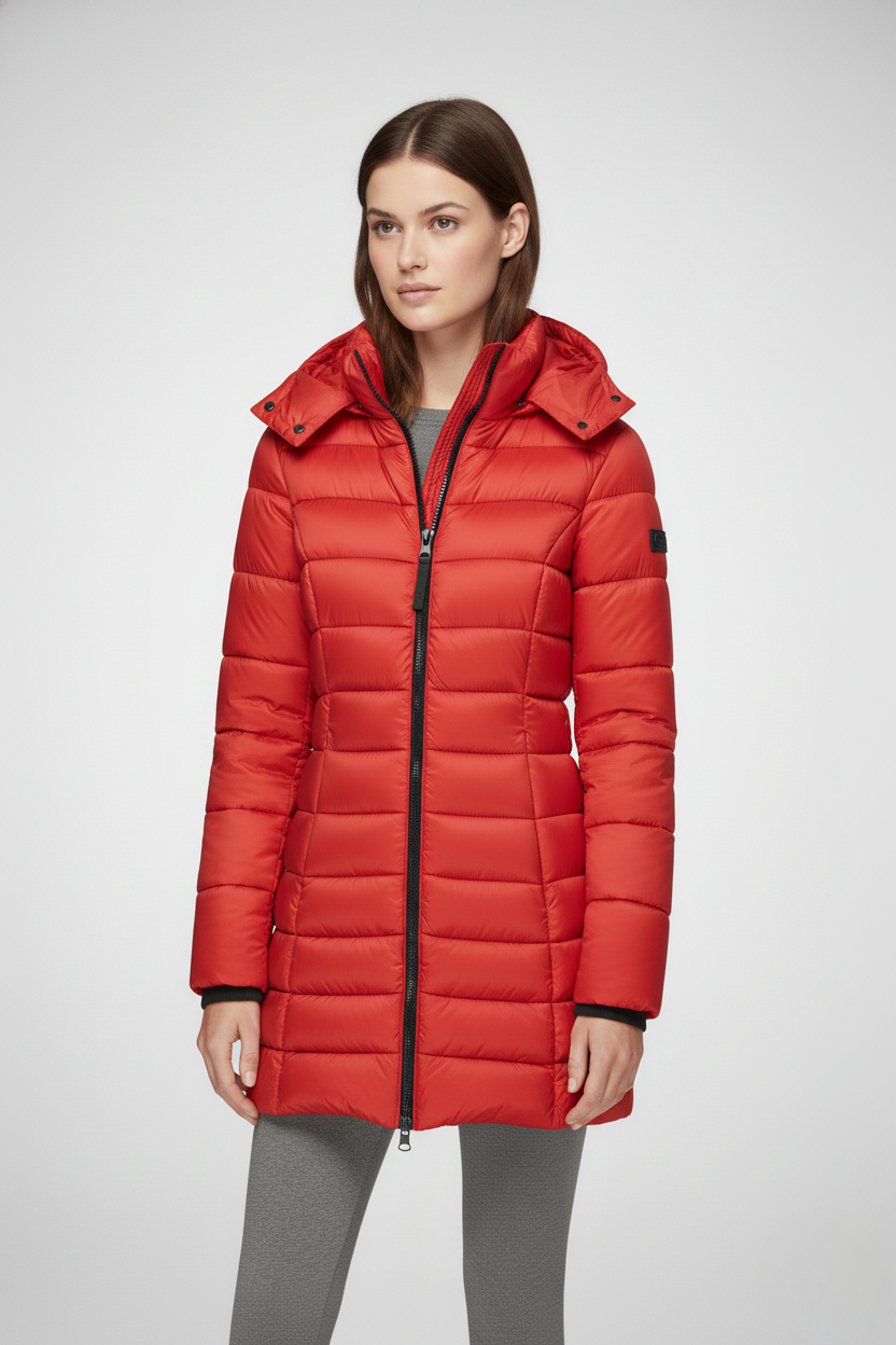 This women’s heated jacket features a fixed hood, a full-length front zipper, and long sleeves finished with ribbed cuffs. The quilted pattern extends across both the body and sleeves, while the side seams create a flattering, close-fitting silhouette. The extended hem falls below the hips, providing added warmth and coverage—perfect for layering in cold weather.