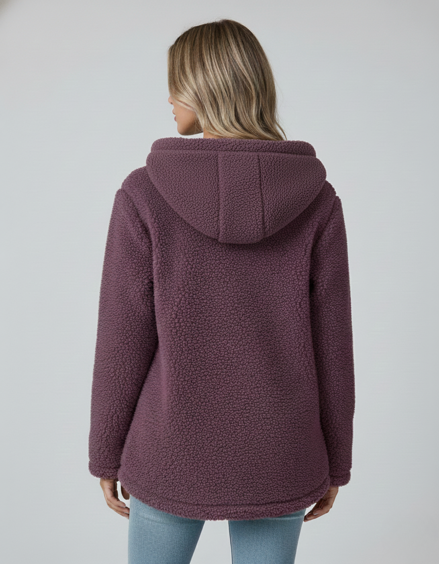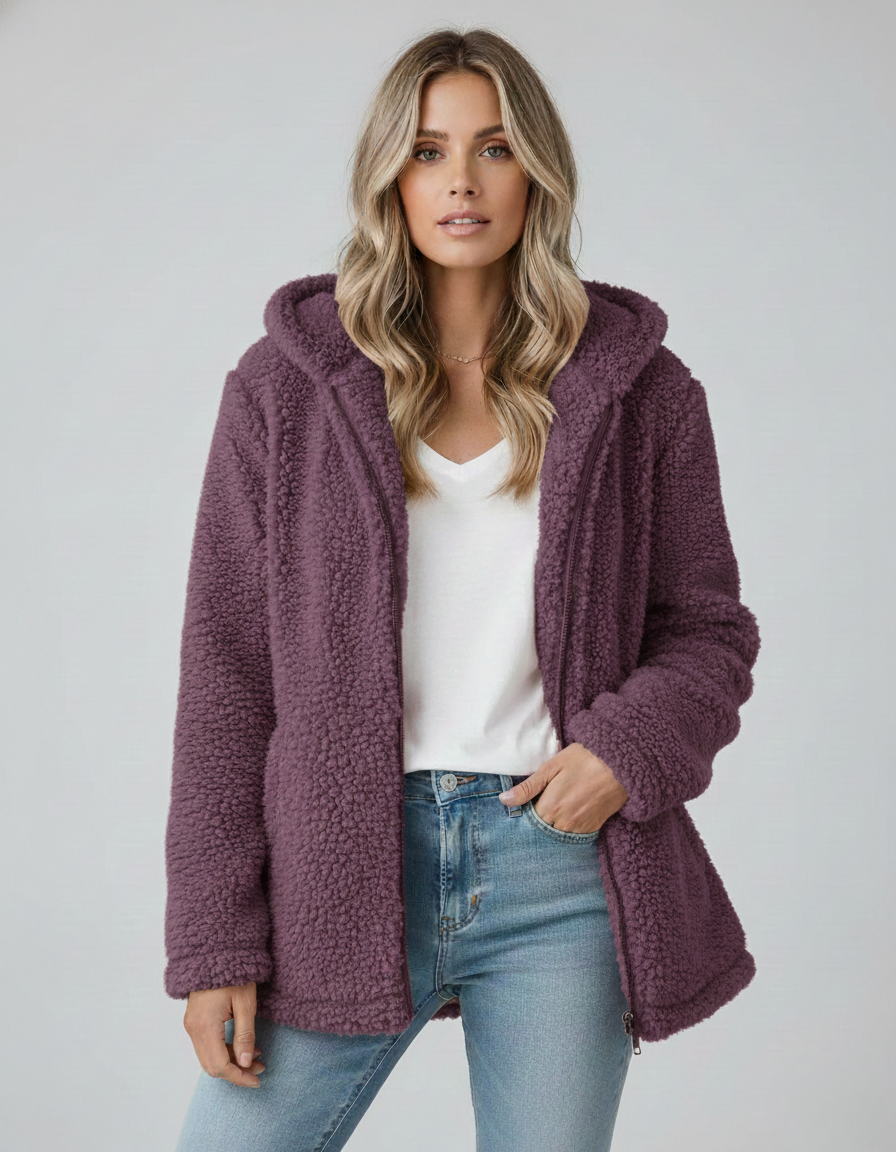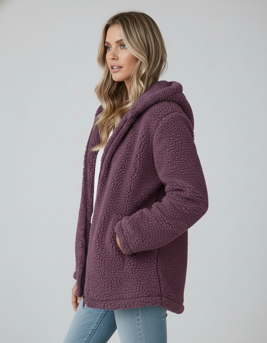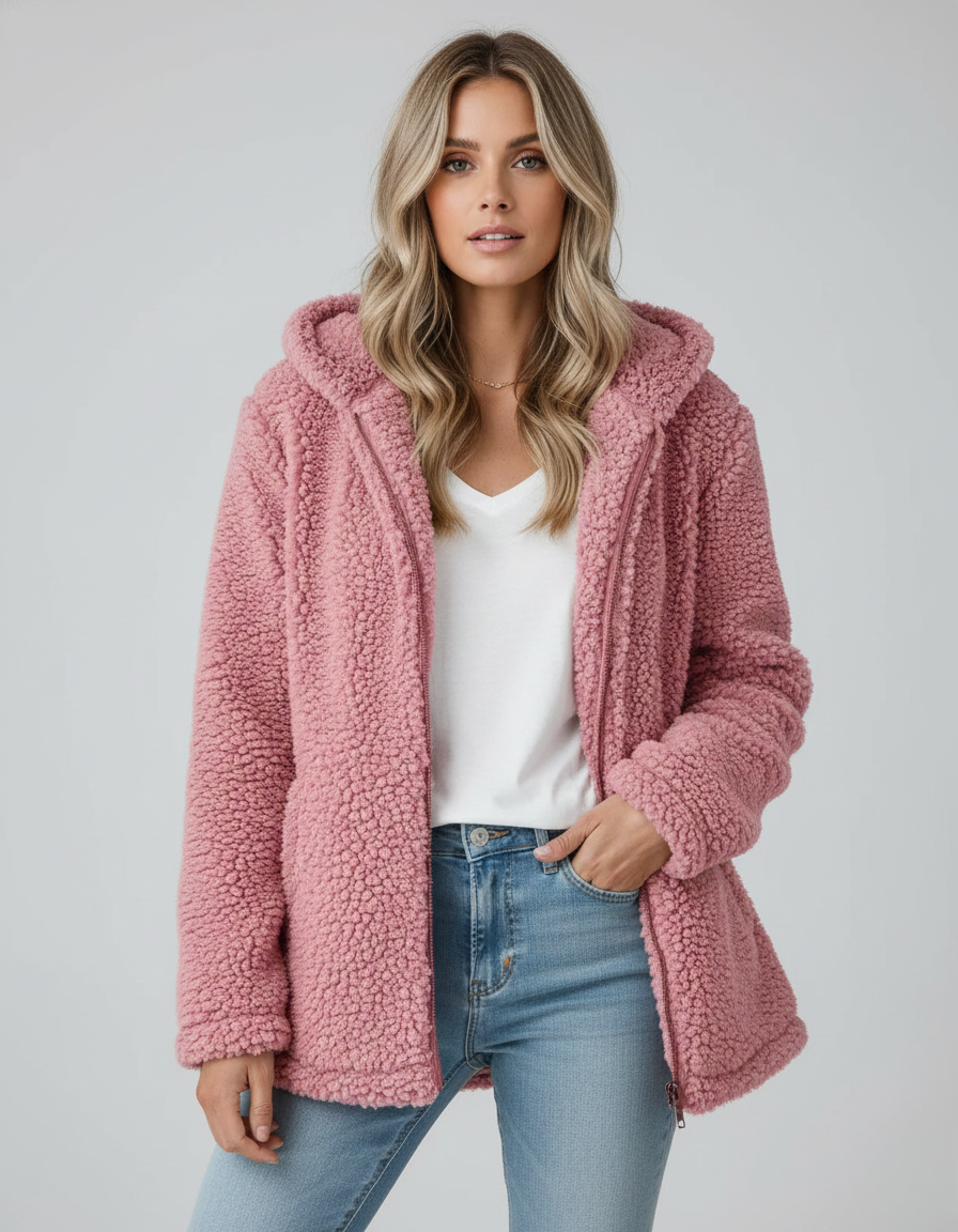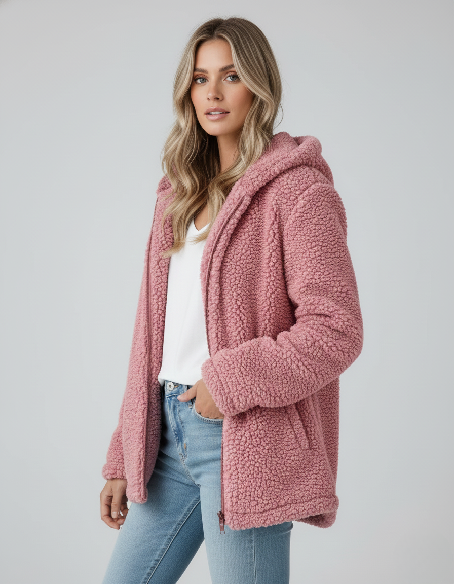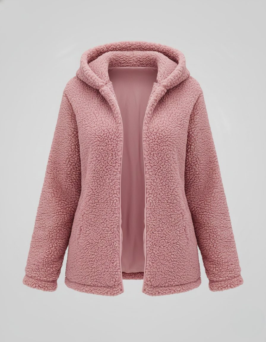 This cozy women's teddy fleece jacket offers a relaxed fit with an attached hood and long sleeves, making it ideal for colder days. Available in multiple colors (pink, purple, black, beige), it features a soft, textured plush exterior that pairs easily with jeans, leggings, or skirts.