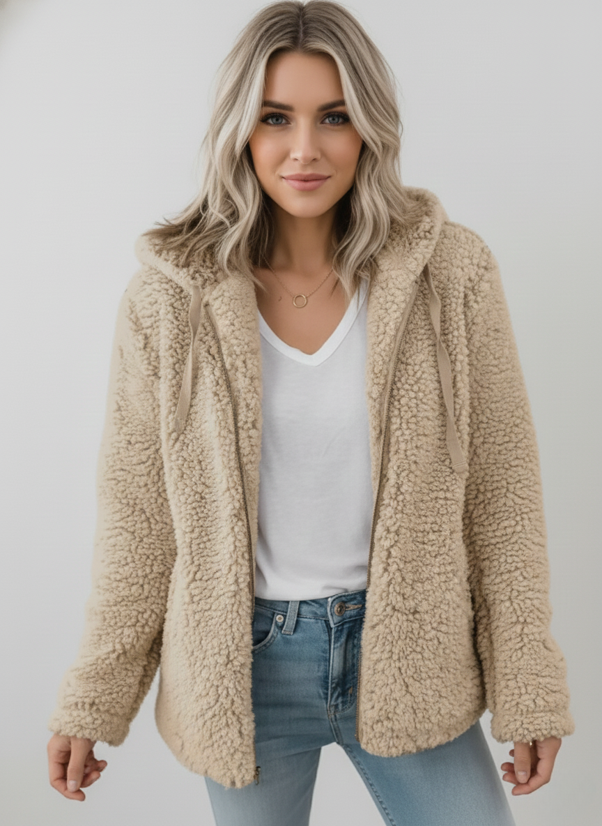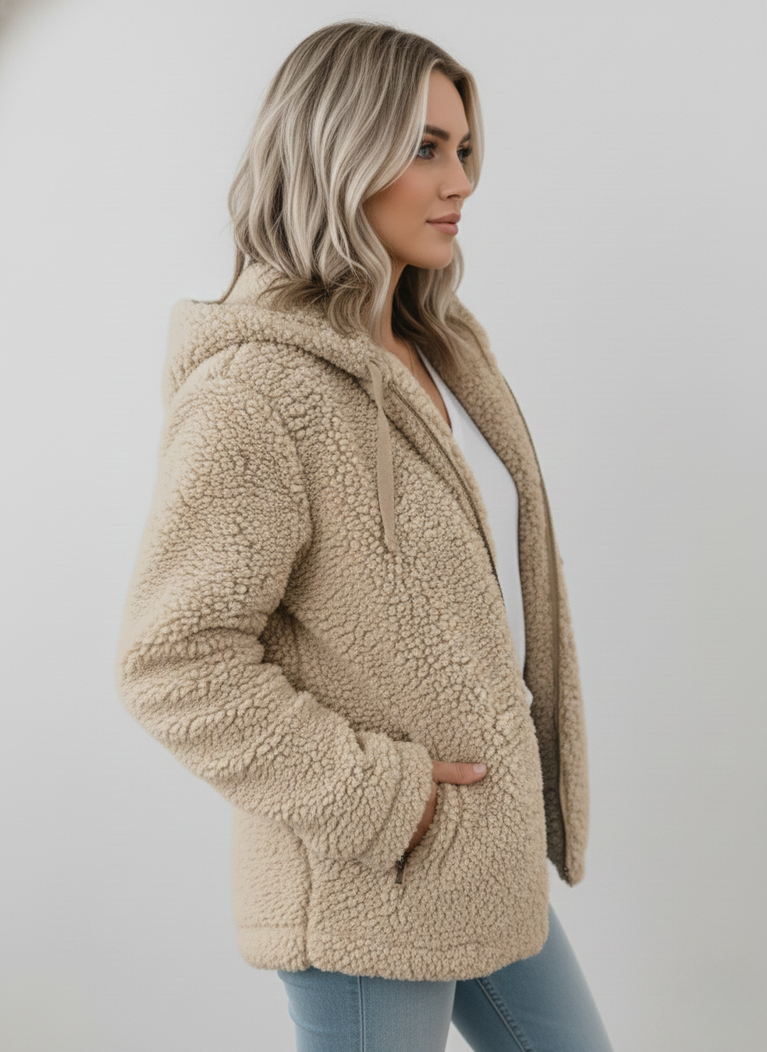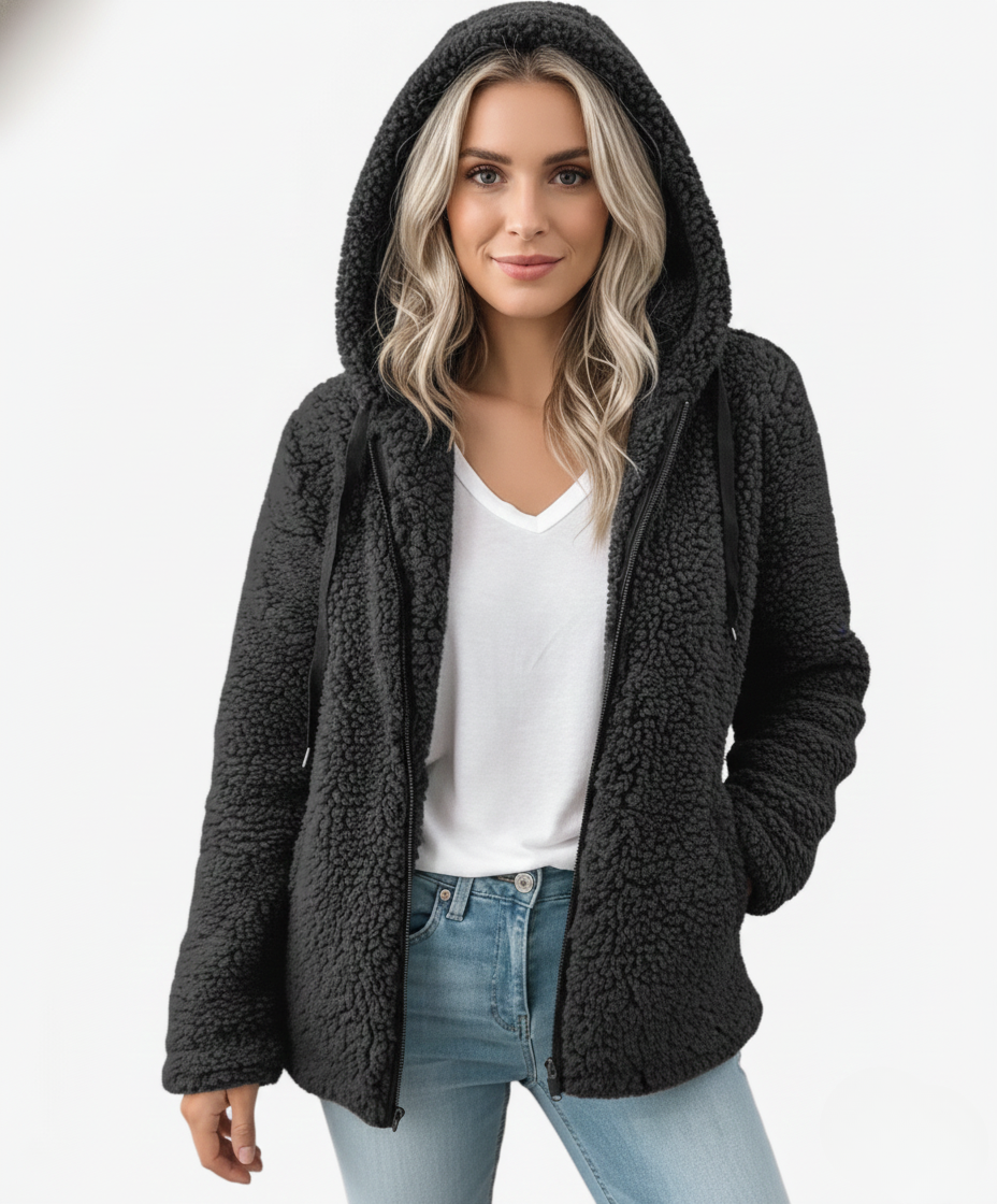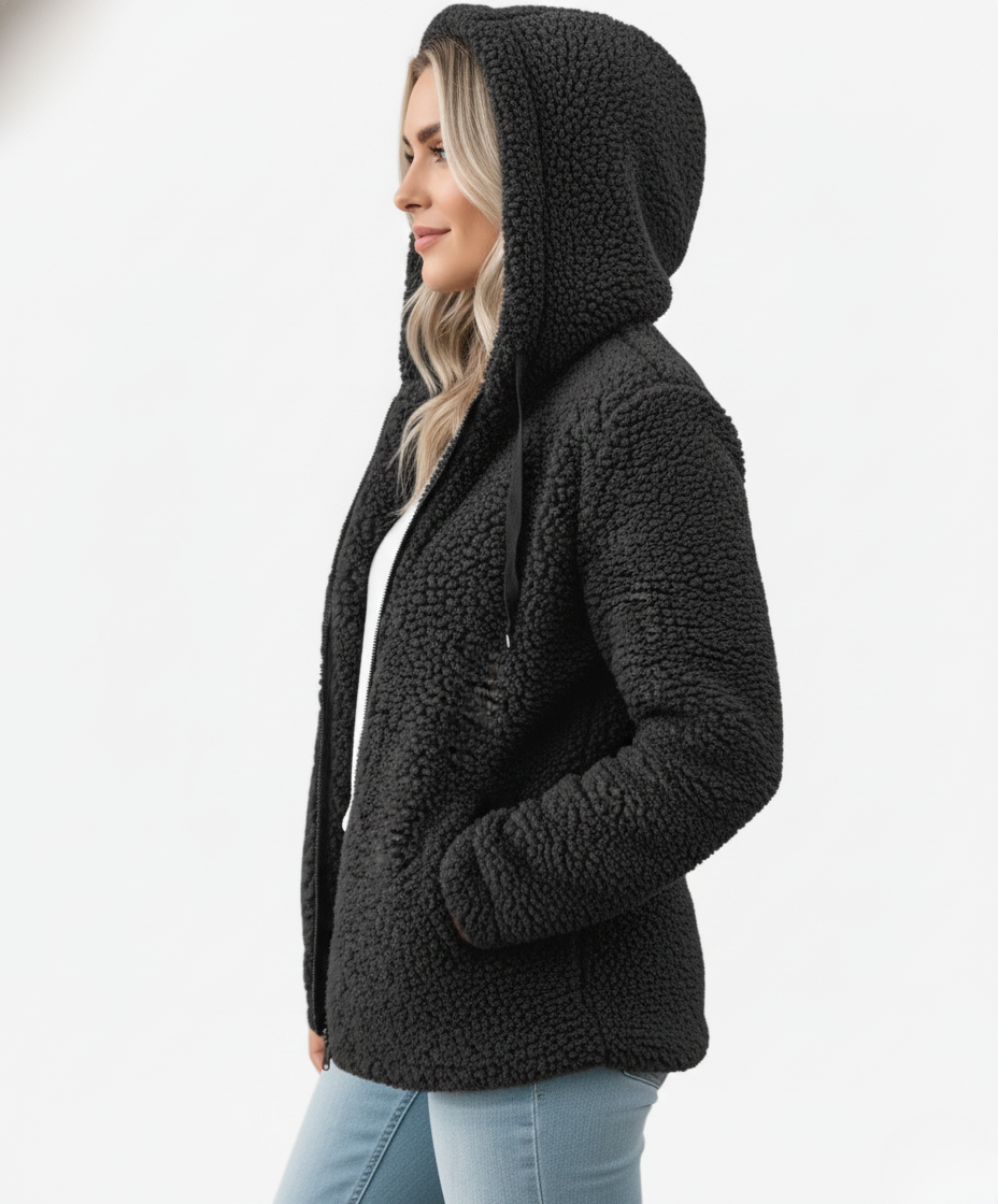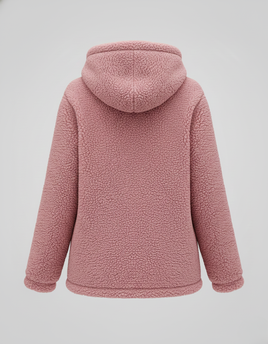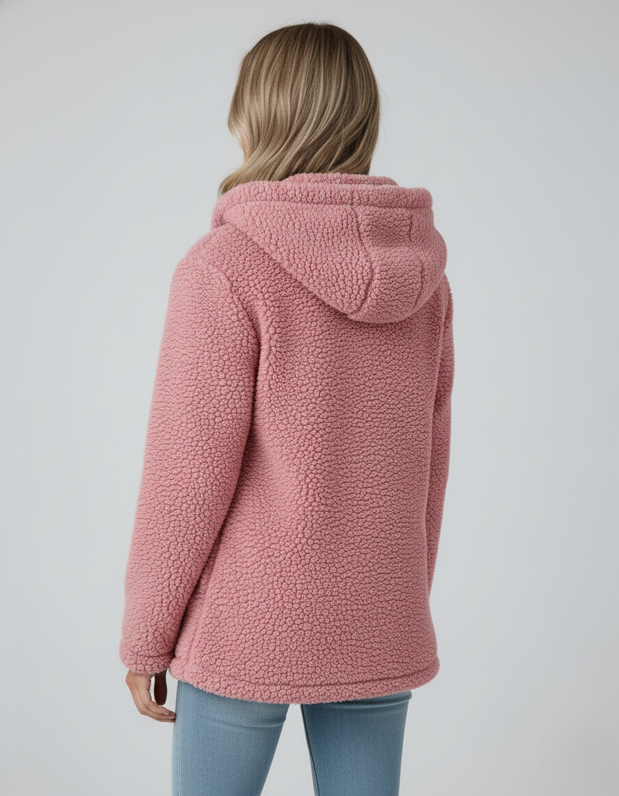 This cozy women's teddy fleece jacket offers a relaxed fit with an attached hood and long sleeves, making it ideal for colder days. Available in multiple colors (pink, purple, black, beige), it features a soft, textured plush exterior that pairs easily with jeans, leggings, or skirts.