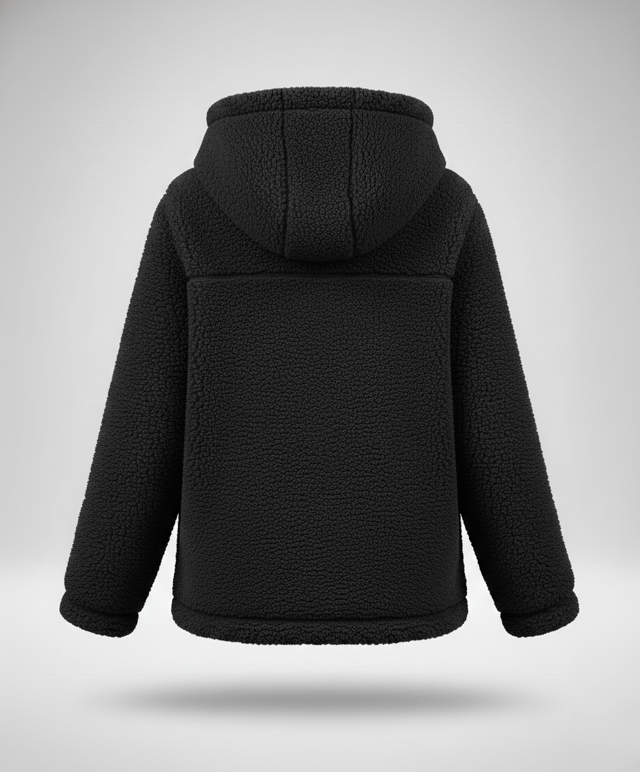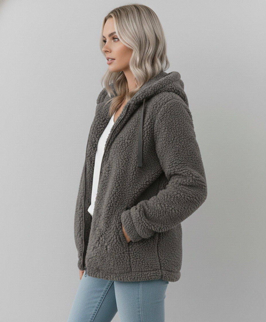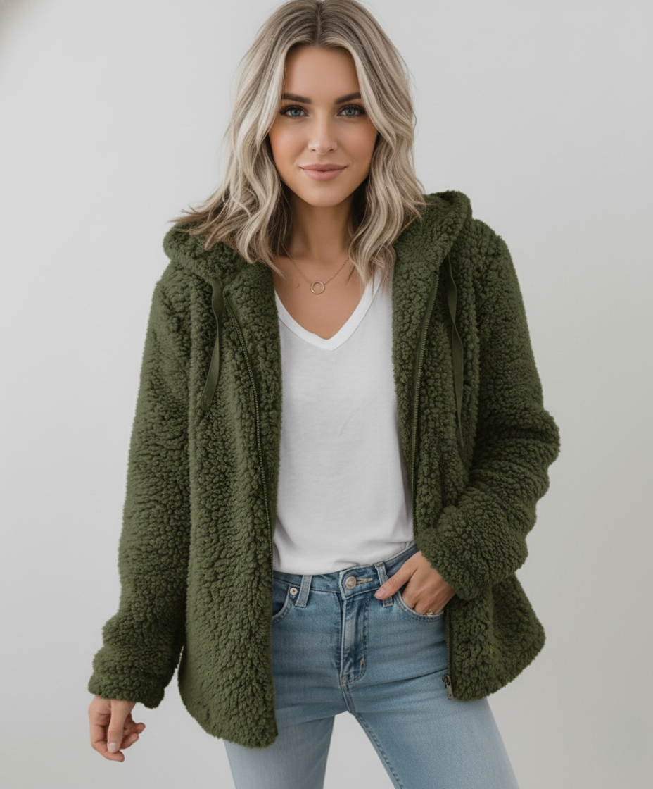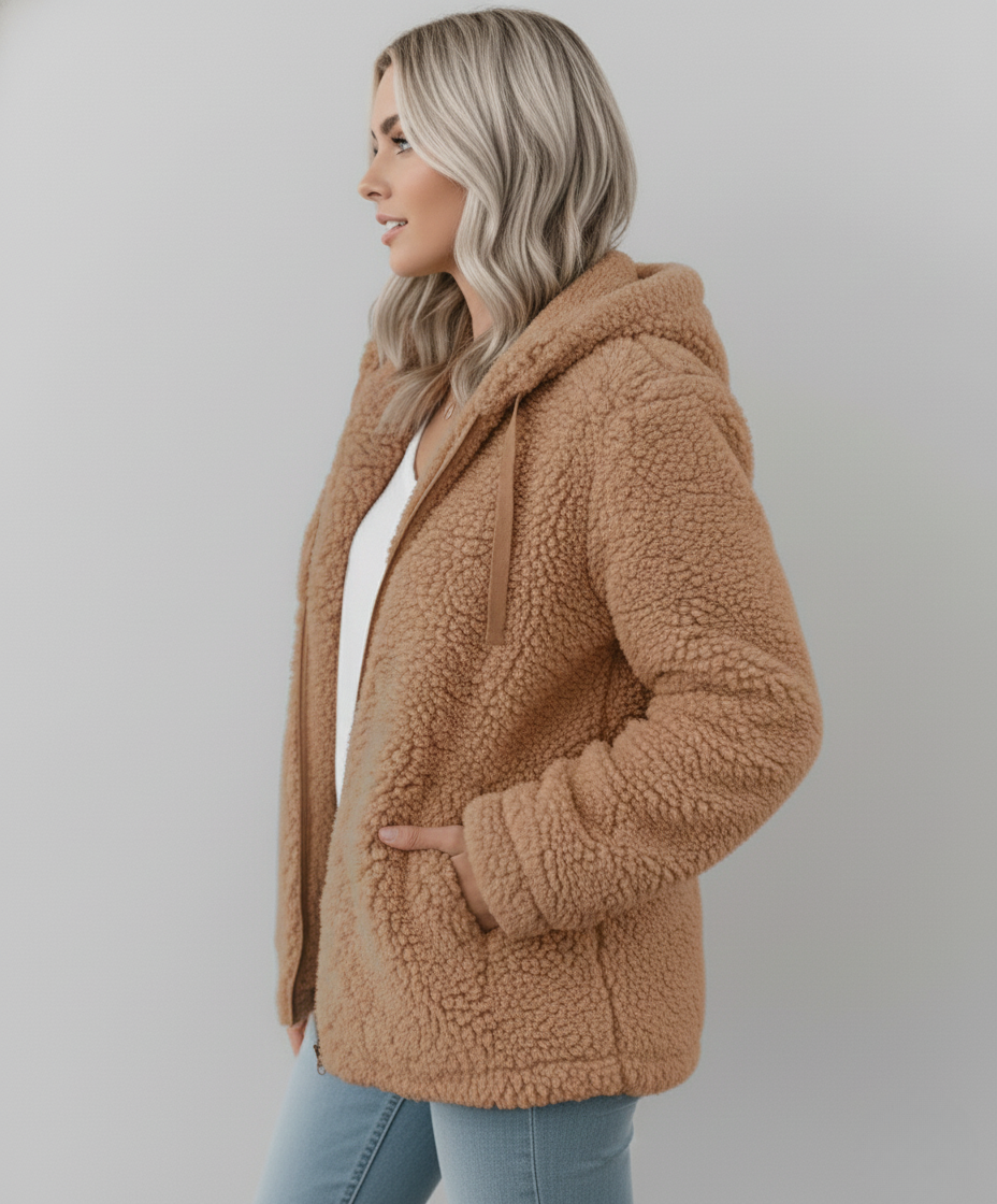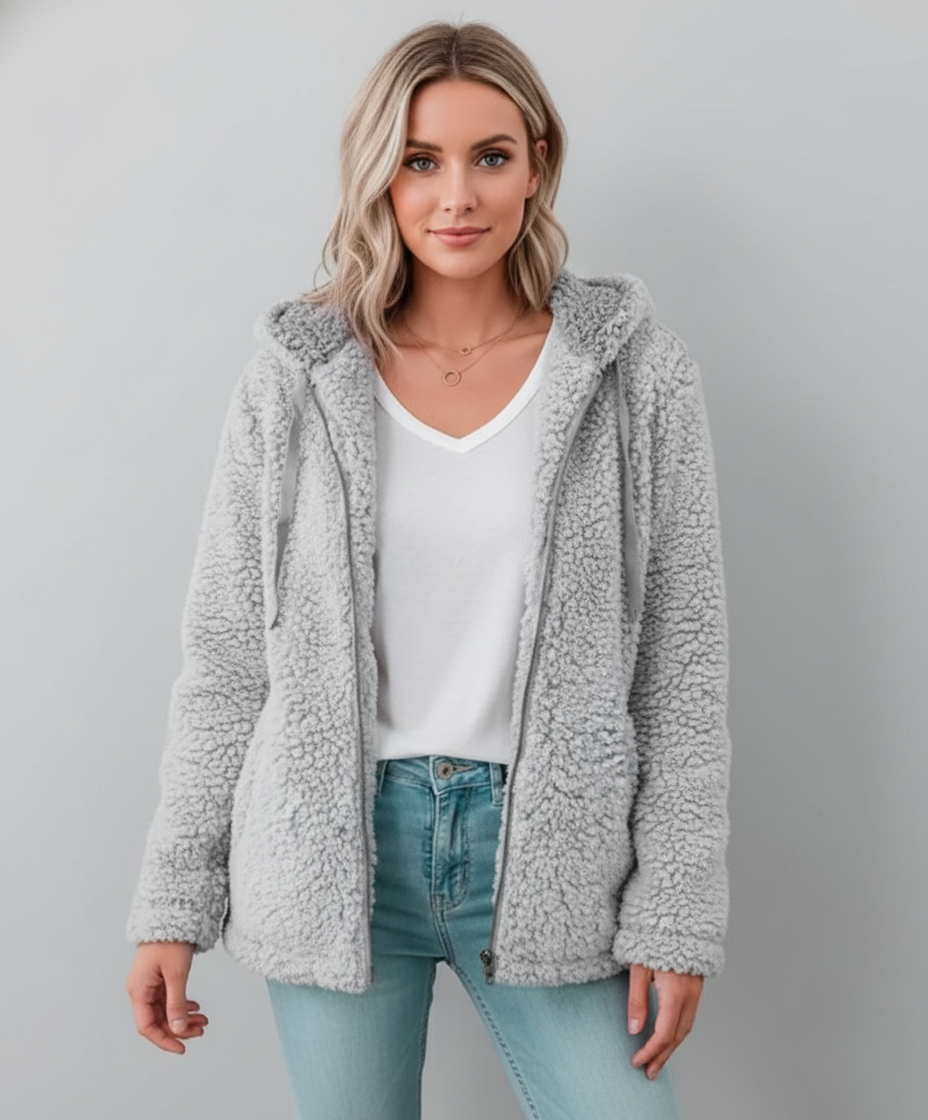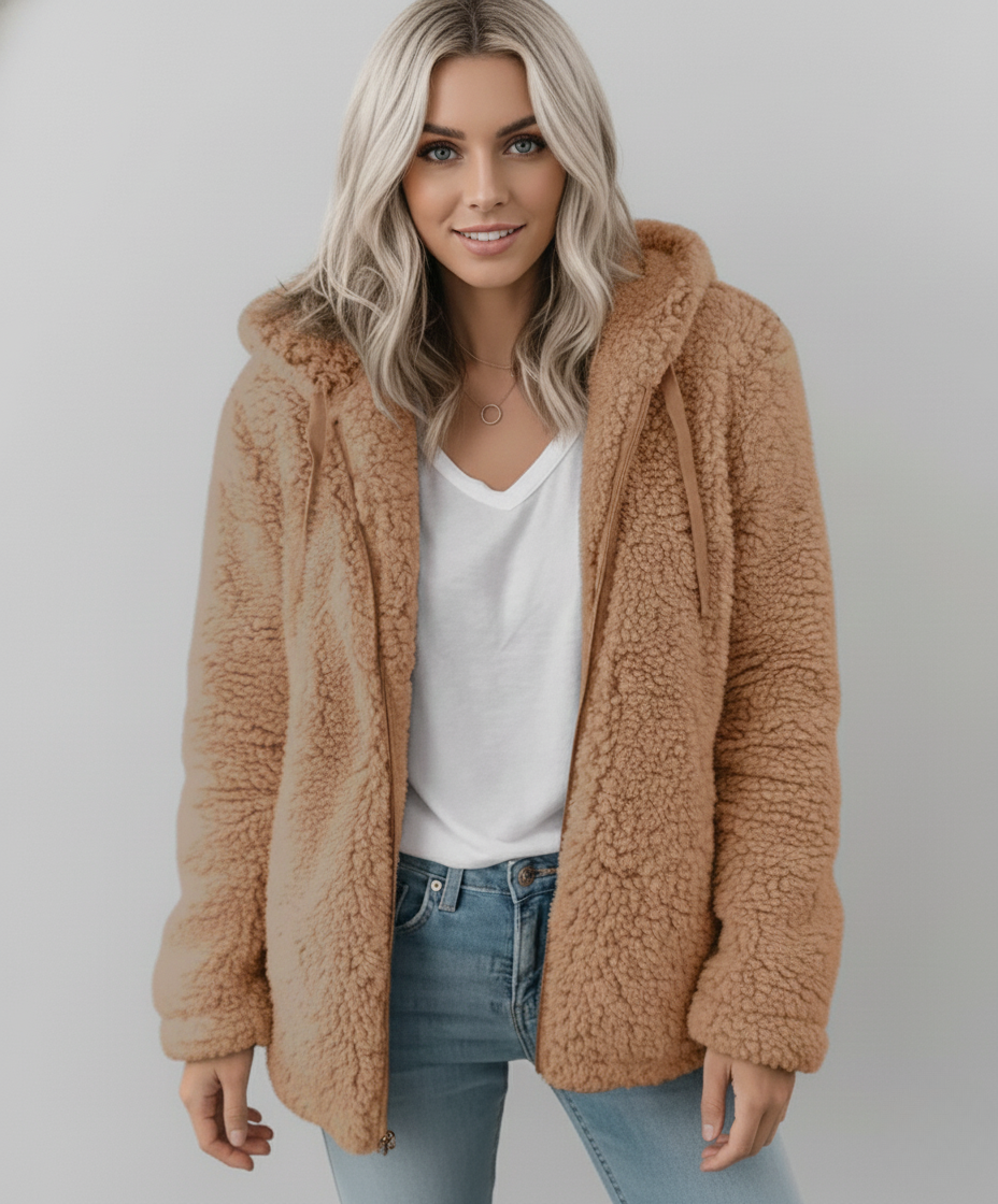 This cozy women's teddy fleece jacket offers a relaxed fit with an attached hood and long sleeves, making it ideal for colder days. Available in multiple colors (pink, purple, black, beige), it features a soft, textured plush exterior that pairs easily with jeans, leggings, or skirts.