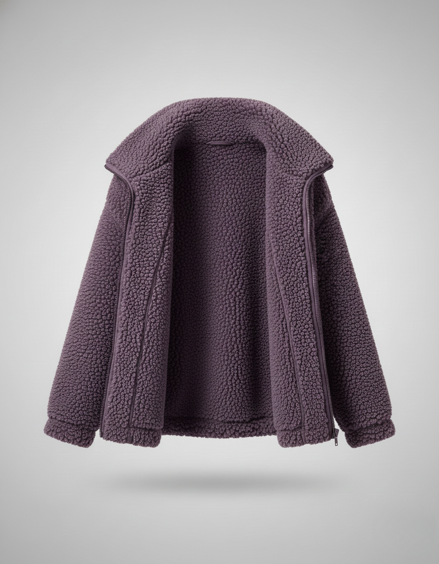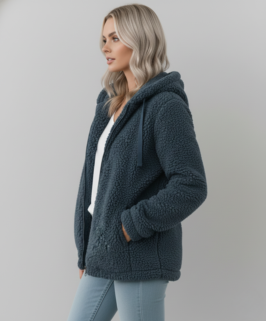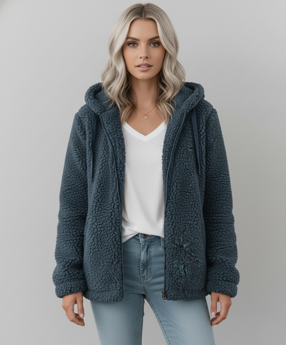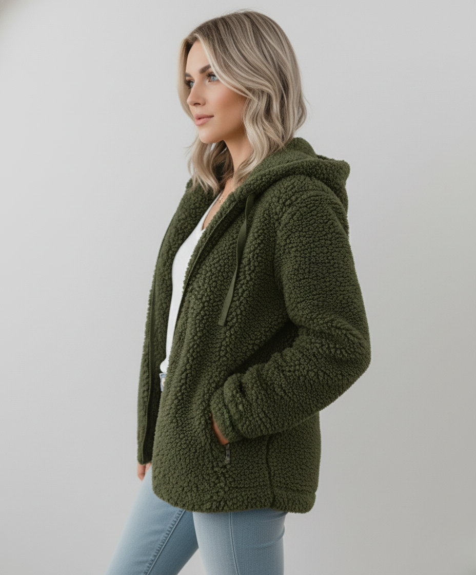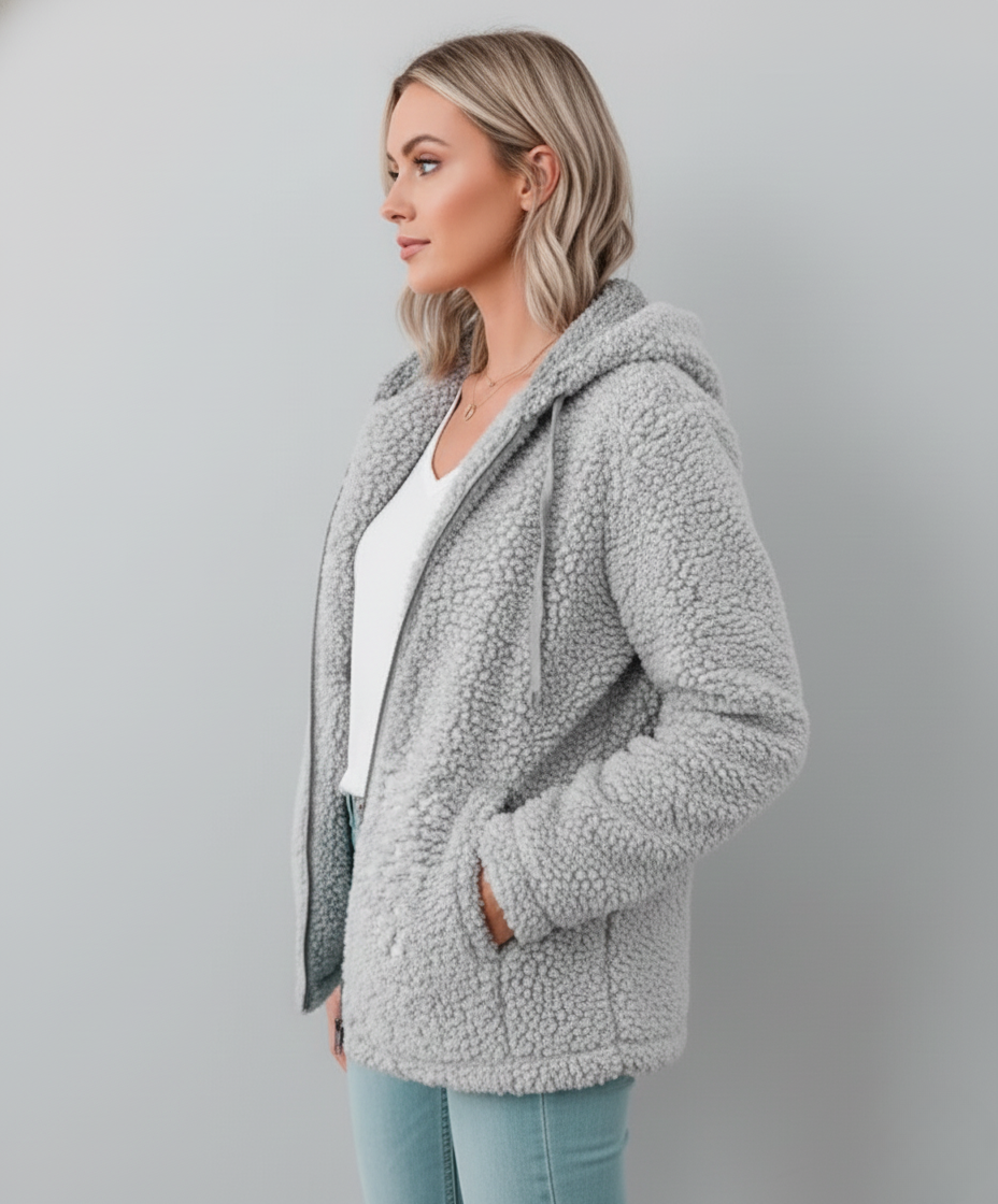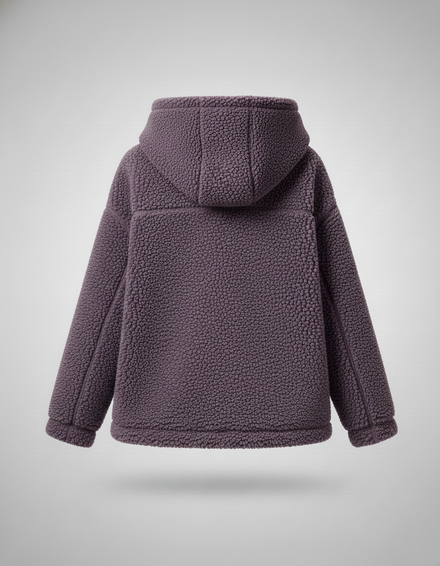 This cozy women's teddy fleece jacket offers a relaxed fit with an attached hood and long sleeves, making it ideal for colder days. Available in multiple colors (pink, purple, black, beige), it features a soft, textured plush exterior that pairs easily with jeans, leggings, or skirts.